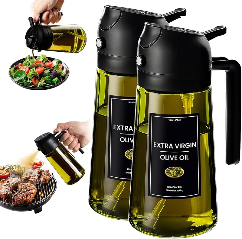 CXINYI - 16oz/470ml Olive Oil Dispenser for Kitchen with Stickers - 2 in 1 Olive Oil Sprayer for Cooking, Air Fryer, and Salad, 2 Black (Light-Proof Kitchen Gadget)