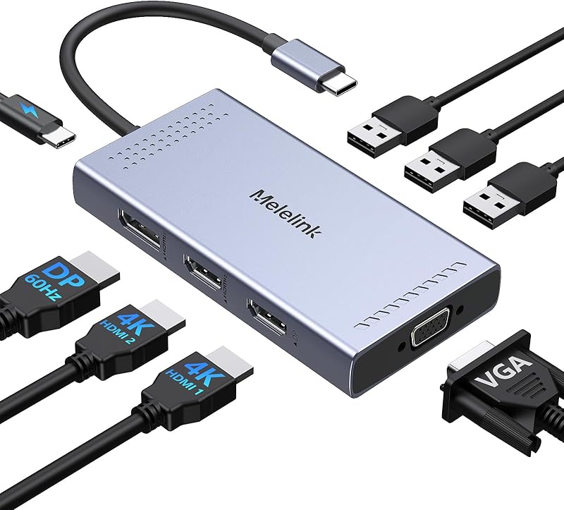 USB C Docking Station Dual HDMI Monitor Adapter, Melelink USB C Hub 3 Monitors Adapter with 2x HDMI 4K,Displayport,VGA,100W PD Charging,3 USB2.0, 8 in 1 Laptop Docking Station for Dell, HP, Lenovo,etc