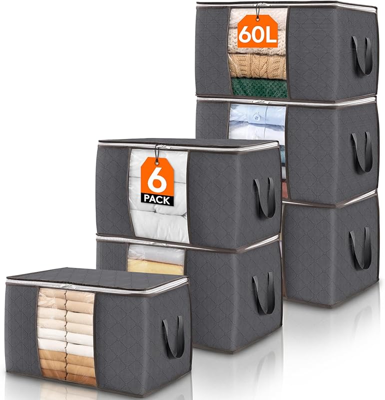 Lifewit 6 Pack 60L Clothes Storage Bins with Lids, Foldable Blanket Storage Bags with Zippers, Clear Window and Reinforced Handles, Closet and Organization for Clothing, Sweater, Comforter, Bedding