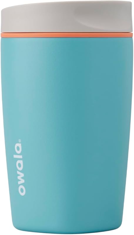 Owala SmoothSip Slider Insulated Stainless Steel Coffee Tumbler, Reusable Iced Coffee Cup, Hot Coffee Travel Mug, BPA Free 12 oz, Grey/Blue (Beachy Breeze)