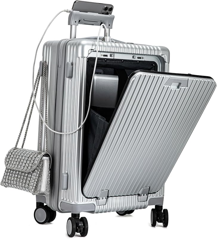 feilario 20in Hardside Spinner Wheel Luggage with Zipper Closure, Built-In TSA lock Carry on Suitcase, with Cup Holder & USB Port & Phone Holder White(with zipper closure, 20in)